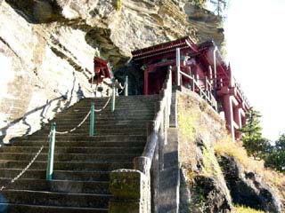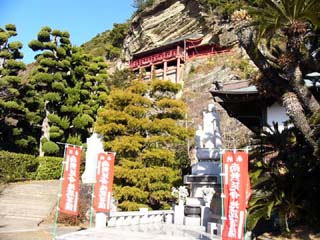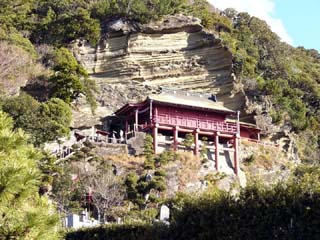 2010/1/14(9:29) 「大福寺」横にある「延命地蔵尊」の前から 見る「崖の観音 観音堂」。 |