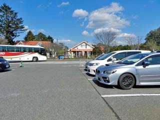 左の写真、遊歩道入口にある第1駐車場の収容台数は普通車30台程だが、 駐車場は、3ヶ所に分かれ、普通車計130台程が収容できる。