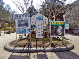 「清水渓流広場」の第1駐車場と遊歩道入口に立つ案内板。 「亀岩の洞窟(通称:濃溝の滝)」は、JR久留里線の終点「上総亀山駅」の南南西約3.8kmに