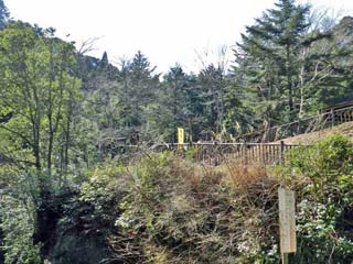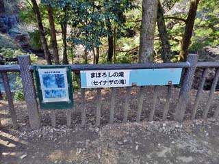 遊歩道(園路)右側に、 まぼろしの滝「セイナザの滝」の案内板。 場所は、案内図左上に「×農溝の滝」と書かれる 辺りである。 |