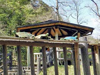 フェンスの上には「亀」の置物。 この後、坂道を下り「亀岩の洞窟」へと向かう。 |