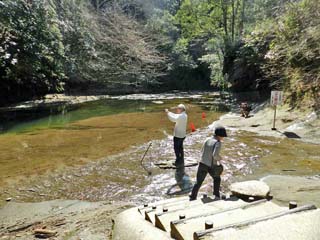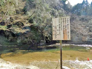 「川辺」に降りる。 「亀岩の洞窟」は、写真左の方向にある。 この場所、案内図には「水遊び場」と書かれ、 川の中は滑りやすいが、川に入るのは