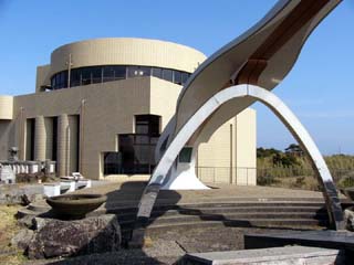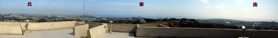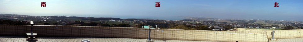 | 2010/2/25(11:11) 「地球の丸く見える丘展望館」屋上の「展望マウンド」から見る景色。(注:この長文の下にも、西側を撮影した写真があります) この日は、未明に房総沖で発生した「移流霧」が、東京湾に流れ込み、「羽田空港」のダイヤが夕方まで乱れた日で、水平線は「ボンヤリ」としか 見えなかったが、ここに立ってみると「な~るほど」、「地球の丸く見える丘」という名前の意味が理解できる。 展望館の建つ「愛宕山」の標高が73.6m。パンフレットには、「展望マウンドに上れば、標高約90m」とある。この標高から計算すると、 水平線までの距離は、34km弱。地図上に定規を当ててみると、北は「鹿嶋市」の東。南は「九十九里浜」のほぼ真中「木戸川河口」付近までの 水平線が見えるということになる。これを角度で見ると、視界の概ね270度の範囲が水平線ということになる。(パンフレットには、330度までが 水平線の大パノラマとある) 天候に恵まれ、水平線が「くっきり」と見え、おまけに「富士山」まで見えれば、「地球が丸く見える」というのは理解できる。 ちなみに、上の写真「東」と記述している下の少し左に「犬吠埼灯台」がある。また、下の写真「西」と記述した右下に弓状の浜のように見えているが、 「刑部岬」がほぼ「西」の方向にあることから、その手前9kmにわたって続く「屏風ヶ浦」、別名「東洋のドーバー」と呼ばれる断崖絶壁であろう。 また、「北」の方向に陸地が続くが、これは「銚子漁港」の方向であり、視界がよければ、「銚子漁港」の先には海が広がり、 その水平線は「北北西」にある「鹿嶋市」の辺りまで続いているはずである。 従って、「屏風ヶ浦」から「鹿嶋市」付近の海岸線までの陸地を除いた周りには、海があるということになる。 このことから、パンフレットにある「330度までが水平線の大パノラマ」というのも、概ね当たっているといえる。 |