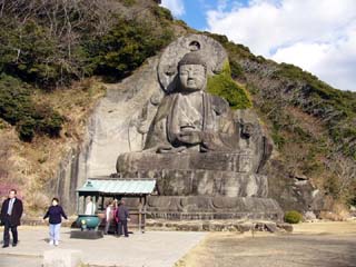 2010/2/3(14:05) 「大仏 薬師瑠璃光如来」 総高31.05m。大仏さまの体だけでも高さが、 21.3mあり、日本一の「大仏さま」である。 原型は、自然の風蝕による崩壊で、昭和44年に 再現され現在に至る。 |