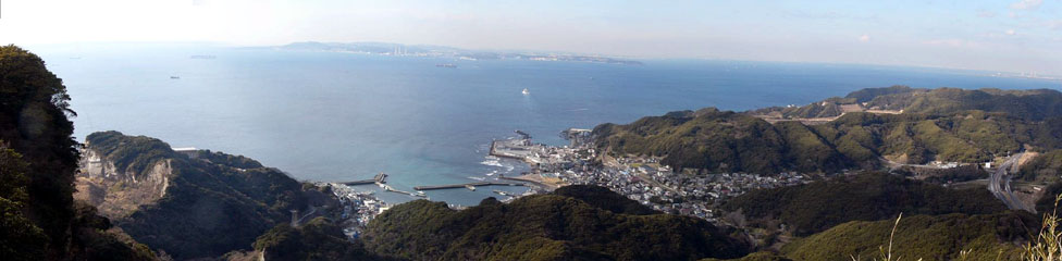 2010/2/3(14:30) 「十州一覧台」から見る景色。 眼下は「金谷港」。「金谷港」の先には「久里浜」に向けて走る「東京湾フェリー」と「三浦半島」の姿も見えている。 |