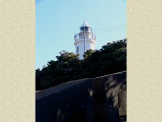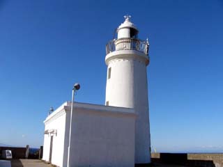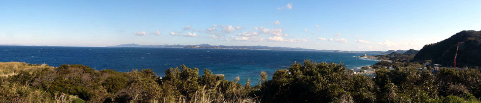 | 2010/1/14(10:16) 「洲埼灯台」から見る北側の景色。対岸陸地の、ほぼ中央に見える山が、内房線「岩井駅」東方にある「富山(標高:350m)」。 対岸陸地の一番左端が「浜金谷」付近。その右の山は「鋸山(標高:329m)」であろう。 |