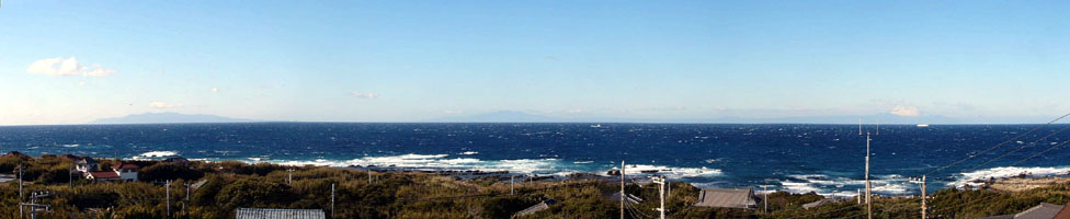 | 2010/1/14(10:11) 「洲崎帝釈天」の近くで見る「伊豆大島(写真左の島)」と「富士山(写真右に、うっすらと白く見える)」。 |