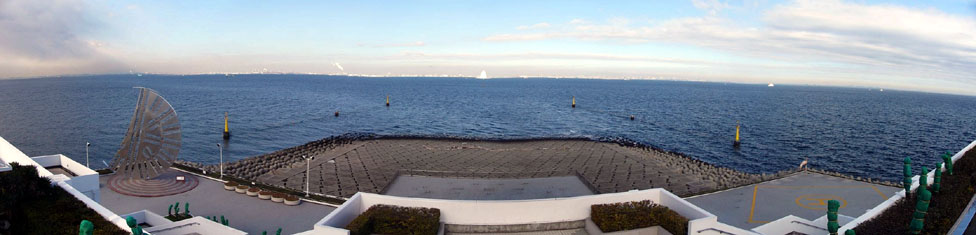 2010/2/3(9:43) 「海ほたる」の川崎側デッキから見る景色。 この海の下に、延長約10kmの「アクアトンネル」がある。 写真中央には、「アクアトンネル」のほぼ中間点(川崎市浮島の沖合約5km)にある「風の塔」が小さく写っている。 「風の塔」は、直径約200m、深さ75mの人工島で、高さ90mと75m2つの塔により、「アクアトンネル」内空気の給排気を行う施設である。 写真左にあるのは「アクアトンネルの掘削に使用した14.14mカッターフェイスの実物大モニュメント」。 なお、「アクアトンネル」の入口は、木更津側にあるため、ここからは見えない。 |