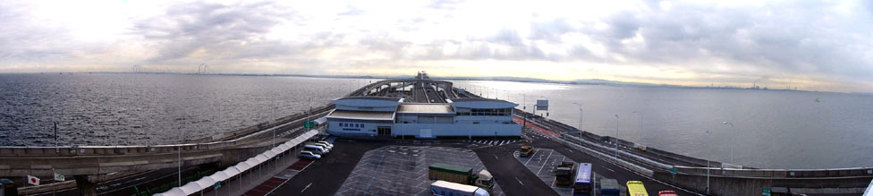 | 2010/2/3(9:47) 「海ほたる」の木更津側デッキから見る景色。 「木更津」までの距離は、約5Km。左右を海に挟まれた「道(橋)」が延々と続く。 「海ほたる」の建物は、写真下に写る1階が「大型車駐車場」。2~3階が「普通車駐車場」。4階が「ショッピング・アミューズメント」。 そして、5階が「展望デッキ・レストラン」と、大きな「サービス・エリア」並みに充実しているが、「ガソリン・スタンド」はない。 |
