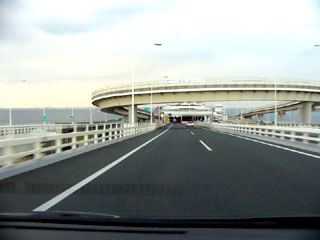 2010/2/3(16:51) 川崎に向け走行する、車の中から見る「海ほたる」。 建物の下が「アクアトンネル」の入口になっている。 |