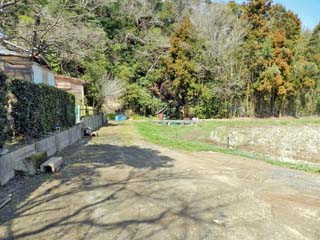 県道176号「夷隅御宿線」を、東に向かうと、 すぐに左(北)に曲がり、民家の方向に歩く。 「川廻しトンネル」は、正面に見える山の下に