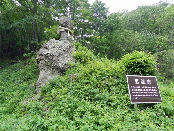 「男根岩」は、「榛名湖」から「榛名神社」に向かう途中の「天神峠」南側にあり、 写真の標識には「この岩は、旧道からの眺めが一番で、 縁結、子授け、安産、下の病等の祈願に効験あり」と書かれている。