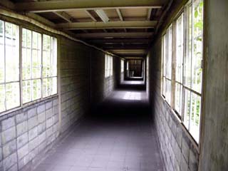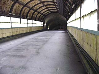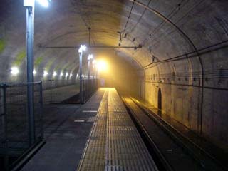 2010/10/8(11:18) 狭い連絡通路を抜け、通路が広くなると、 その先は「地下ホーム」への階段である。 写真奥の暗い所は階段で、よく見ると、階段の 左側には、傾斜に沿って斜めにつけられた 蛍光灯が2本見えている。 |