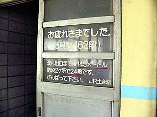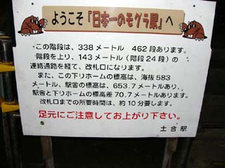2010/10/8(11:26) 「土合駅」で下車し、これから階段を登ろうと する人達を「歓迎」する看板。 階段を降り切ったところにあった。 |
