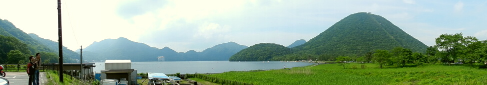 | 2012/6/24(14:47) 「榛名湖」南東の湖岸から見る景色。 「榛名湖」は、榛名山山頂に位置する周囲約6km、最大水深12.6mのカルデラ湖であり、周囲を複数の山が取り囲む。 写真右に「榛名富士(標高:1,390m)」。奥に並ぶ山の中で左に高く写るのが、 「榛名山」の最高峰「掃部ヶ岳(かもんがたけ、標高1,449m)」である。 |