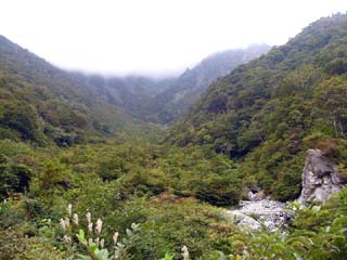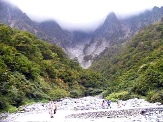 2010/10/8(12:07) 「一ノ倉沢出合(旧道)」から見る「一ノ倉沢」。 上の方は霧で隠れているが、怖さを覚えるほどの迫力は、この写真でも伝わるものと思う。 注:写真は、横が1,288ピクセルあります。写真直下にあるスクロールバーをご利用ください。 |