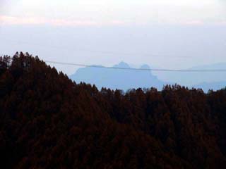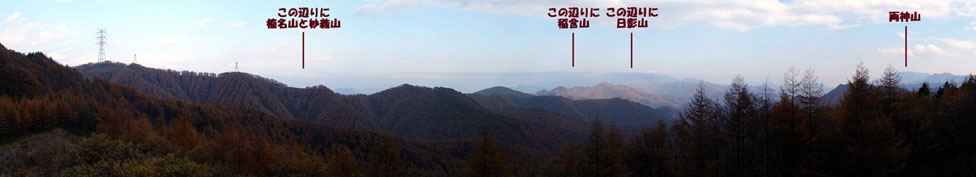 2010/11/8(12:50) 12時49分のパノラマ写真で、「この辺りに榛名山 と妙義山」とある下の少し右に、うっすらと 見えている山である。肉眼で見た時には、これが 「妙義山」だと思ったのだが、「妙義山」は、 もう少し左にあり、この日は見えなかった。 この山は、「十石峠」の北東約13kmにある、 「鹿岳(一ノ岳):標高1,010m」であろう。 |