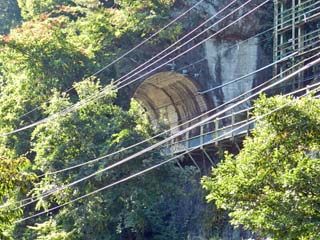 2014/9/28(14:41) 「旧川原湯温泉駅」側から撮る「樽沢隧道」。 この場所は、ダム本体(堤体)の下流に位置するため、 ダムの底には沈まずトンネルは残るのだが、 鉄道路線としての役目を終えるため、「日本一短い鉄道 トンネル」の看板は、JR西日本「呉線」の「川尻トンネル」 の全長8.7mに譲るという。 写真をクリックすると拡大写真(450x600)が 表示されます。 |