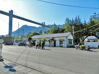 2014/9/28(14:48,14:48) 「旧川原湯温泉駅」。 旧線路の営業は、平成26年(2014)9月24日の営業で終了。新線路は、旧線路からの切り替え工事を経て、 10月1日から営業を開始。 撮影した日は、営業終了後4日目であり、新線路での営業が開始するまでの間である。 この間は、代行バスが運行されており、バスの乗車券を販売するなどの業務のため、「旧川原湯温泉駅」は、 未だ営業中であった。 左の写真、背後に写るのはダム建設で造成された長野原町の川原湯と川原畑両地区を結ぶ全長494mの 「八ッ場大橋(旧称:八ッ場ダム湖面1号橋)」で、橋脚の高さは最大77.5mというから、この場所がダムの底、 いかに深い所に沈むかが想像できる。 なお、「八ッ場大橋」も新線路と同様、平成26年(2014)10月1日に開通したという。 |