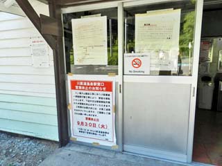 2014/9/28(14:49) 「旧川原湯温泉駅」入口。 駅舎の入口には「駅舎移転のため9月30日で営業を 休止」のポスターが貼られている。 |