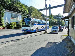 2014/9/28(14:52) JR「吾妻線」線路付け替えに伴う「代行バス」。 「代行バス」は、平成26年(2014)9月25日~30日の間、 「中之条駅」から「大前駅」間で運行された。 「代行バス」の右に写る車やバイクは、水に沈む前の 「旧川原湯温泉駅」を見るために集まった人達である。 |