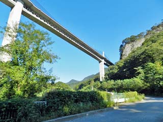 2014/9/28(15:00,15:01) 「不動大橋(旧称:八ッ場ダム湖面2号橋)」。 建設中の十字架のような姿が、新聞やテレビで頻繁に報じられた橋であるが、平成23年(2011)に開通している。 川原湯地区と林地区の間590mを結び、近くの名滝「不動滝」にちなみ「不動大橋」と命名されたという。 写真は、「旧川原湯温泉駅」から国道145号線を西に2.4km程走り「吾妻川」を右岸に渡った所で撮影。 なお、平成22年(2010)年に「橋げた」が一本につながった直後に、反対側の「川原湯温泉」側から撮影した 「不動大橋」のパノラマ写真を「吾妻渓谷」のページで紹介しています。 吾妻渓谷のページへ |