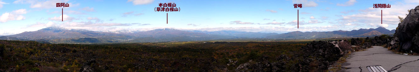 2010/10/27(12:29) 「高山コース見晴台」からパノラマで見る景色。 地元「嬬恋村」をはじめ、展望に恵まれた日であれば、「北アルプス」「谷川」「日光男体山」などが望めるという。 注:写真は、横が1,332ピクセルあります。写真直下にあるスクロールバーをご利用ください。 |