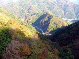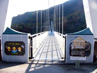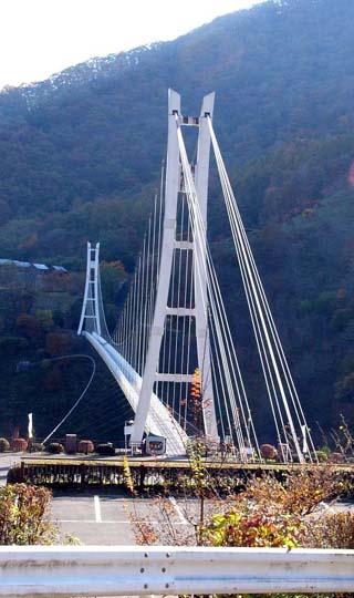 2010/11/8(9:00) 「上野スカイブリッジ」は、群馬県上野村を走る 国道299号線を南に入ったところにある。 橋は高さが90m。長さ225m。 歩行専用の吊り橋としては日本有数のスケールを 誇る。 |