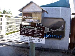 2010/11/8(8:57) 「上野スカイブリッジ」の通行に際しては、 「公園管理費用」として、1人1往復100円 (2010年現在)を、写真の木箱に入れると、 記念のパスポートがもらえる。 |