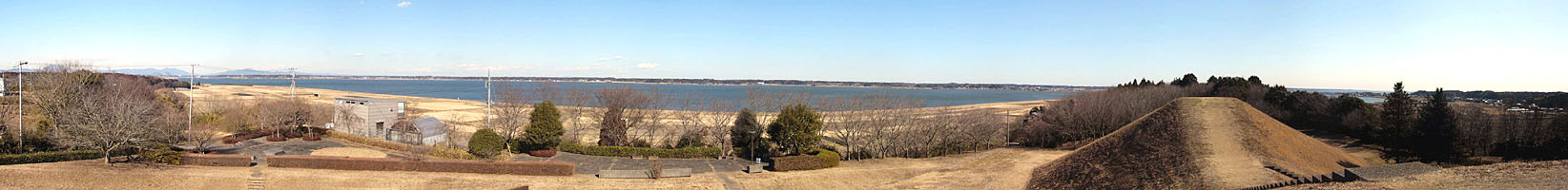 2011/2/1(11:46) 「1号墳(後円部)」の上から見る「霞ヶ浦」方向の景色。 写真左に「筑波山」(木の枝の奥で、はっきりとは見えない)。右には「1号墳(前方部)」が写っている。 また、「霞ヶ浦」の手前に「公園」のように見えているのが「展示休憩広場」。 注:写真は、横が1,644ピクセルあります。写真直下にあるスクロールバーをご利用ください。 |
