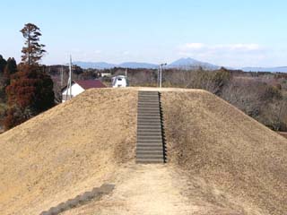 2011/2/1(11:48) 「1号墳(前方部)」の上から見る 「1号墳(後円部)」。 写真奥の一番高い山が「筑波山」。 |