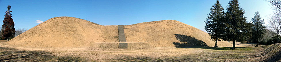 2011/2/1(11:43) 「富士見塚古墳」。 左側2つの丘が「1号墳(前方後円墳)」。右側が「2号墳」。木の陰で、暗く見づらいが「2号墳」の右には「3号墳」が小さく写っている。 注:写真は、横が1,211ピクセルあります。写真直下にあるスクロールバーをご利用ください。 |