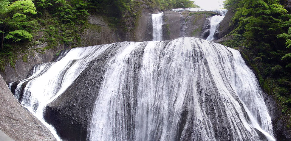 2010/5/15(11:23) 「第1観爆台」から見る「袋田の滝」。 「袋田の滝」は、「久慈川」支流の「滝川」上流にあり、滝の長さ120m。幅73m。四段に落ちることから、別名「四度の滝」とも呼ばれている。 「華厳の滝」「那智の滝」と共に、日本三名爆のひとつに選ばれ、冬季は全面凍結する滝としても有名である。 広角レンズであれば、1枚に収まりそうであるが、この写真は、縦に撮影した写真5枚をパノラマ風につなげている。 |