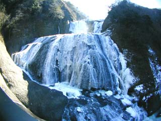 2001/2/?? 凍結した「袋田の滝」。 2001年2月、超広角レンズにて撮影。 この時は、一部水が流れており、全面凍結では なかった。 |