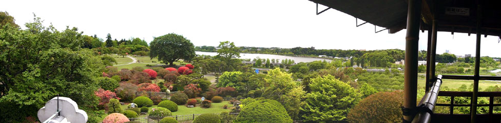 2010/5/14(11:45) 3階「楽寿楼」から見る景色。庭園の向こうには「千波湖」が見えている。視界の良い日には、ここから「筑波山」等も見えるそうである。 |