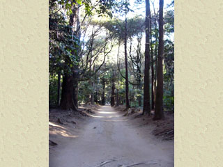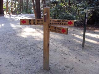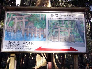 2011/2/1(14:16) 「大鳥居」を入ったところにある案内図。 図の右方に「大鳥居」がある。「大鳥居」を 入り、左の方向に、参道を進むと、突き当りの 右側に「奥宮」がある。 「大鳥居」から「奥宮」まで、片道約520m。 「奥宮」を右に進むと「要石」まで、 片道約150m。「奥宮」を左に進むと 「御手洗」まで、片道約200mである。 本HPでは、これらを往復する、約1,740m を歩き撮影した写真を紹介する。