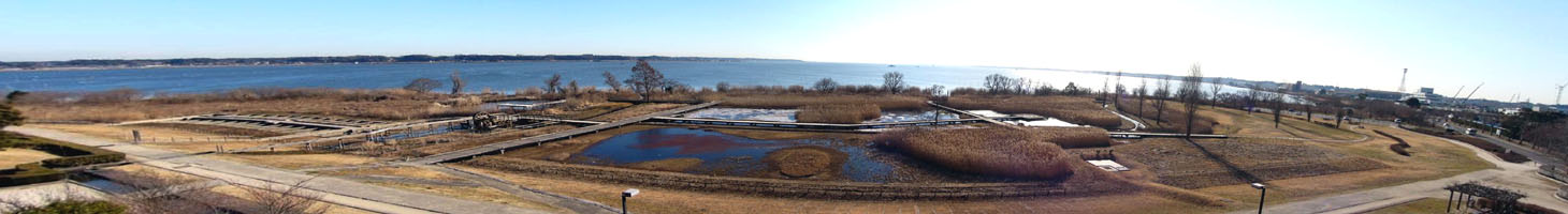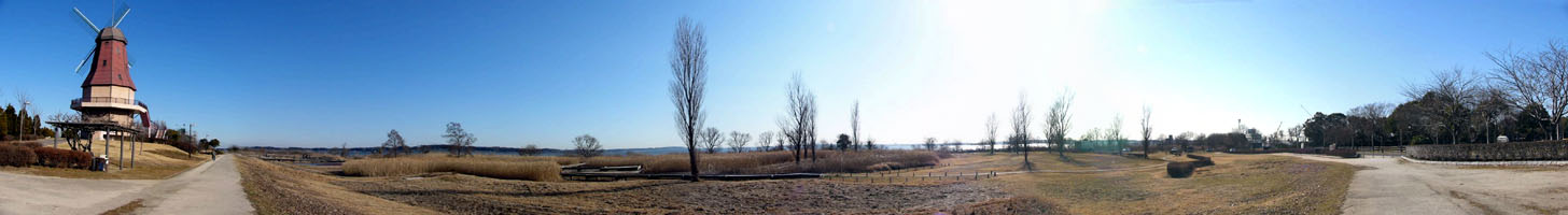 2011/2/1(9:12) 「オランダ型風車」展望台から見る「霞ヶ浦」。 「霞ヶ浦」の手前に拡がるのが、「水生植物園」。 注:写真は、横が1,460ピクセルあります。写真直下にあるスクロールバーをご利用ください。 |