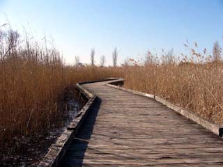 2011/2/1(9:19) 「水生植物園」の木道。 「水生植物園」では、「アシ原」の群生を はじめ、「アサザ」などの水生植物を見ることが できる。 |