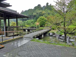 お休み処「桃源」の前に広がる庭園。 お休み処「桃源」は、「西山の里」の入口にある 休憩施設で、和風レストランや土産物の販売、 観光案内などを行っている。 お休み処「桃源」と「西山荘」との間に広がる 8,000㎡の園地には、池や橋を配した庭園が 造られ、四季折々の花が咲く。 |