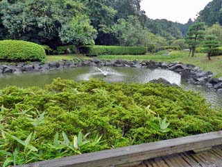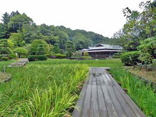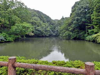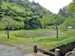 「紅蓮池」。 「瓢箪池」とも呼ばれ、季節には赤い蓮の花を 咲かせるという。 右奥には、「西山荘」が見えている。 |