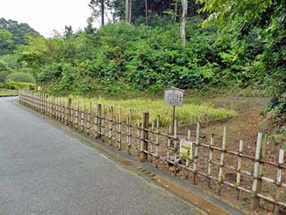 西山荘前の「庭園」。 案内版の右にあるのが、昭和4年(1929)、昭和天皇 行幸のときの「御座所跡」。 左には、「光圀公」が毎年元旦に京都を遙拝したという 「遙拝石」がある。