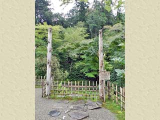 「くぬぎ(櫟)門」。 「櫟(くぬぎ)」の丸太が立つだけの質素な門である。 近くには「下乗」の立て札が立ち、ここから先は、
