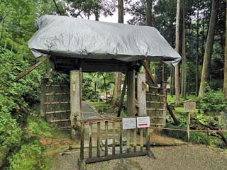 「通用門(裏門)」。 この日は、屋根の復旧工事中であった。 家臣や近所の領民が出入りする「通用門(裏門)」が、