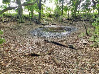 2015/9/15(13:34,13:34) 「玉手ヶ池」。 池は、石碑や案内板の位置からは見えず、案内板の裏(左の写真奥)にある。 案内板には、「底知らずの池、雨乞いの池といわれ」とあるが、この日の池は「水溜まり」の様であった。 また、池の名称は足柄峠の守護神「足柄明神姫玉手姫」から付けられたとある。 |