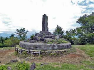 2015/9/15(13:38) 「生田蝶介」の歌碑から見る景色。 写真左、標高の一番高く写るのが「金時山(猪鼻岳)」、中央奥に「位牌岳」と「越前岳」が並ぶ。 その右に「富士山」があるのだが、雲に隠れ見えていない。 |