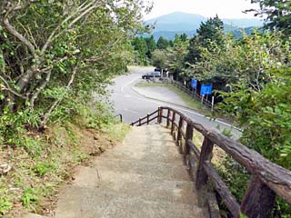 2015/9/15(13:51) 石段を県道へと降りる。 写真中央上、車の止まる場所が駐車スペースで、 その手前に「笛吹塚」がある。 なお、写真奥に伸びる道は、神奈川県道731号 「矢倉沢仙石原線」で、この先で登山道に変わり、 車は通れなくなるが、県道は「金時山(猪鼻岳)」の 山頂を通り、箱根の「仙石原」へと続いている。 つまり、「金時山」の山頂には、県道が通っており、 神奈川県道の最高標高地点(標高1,212.5m) なのである。 |