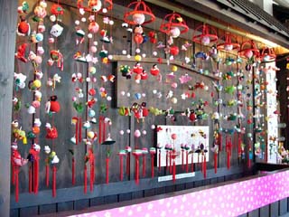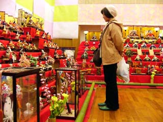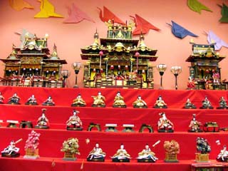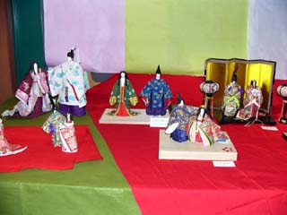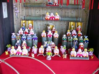 | 2010/2/22(14:17~14:21) 「おひなさま」の種類は、「段飾り」「御殿飾り」「源氏枠飾り」「つるし飾り」「和紙びな人形」「土びな人形」等がある。 左の写真は、「御殿飾り」であろう。「御殿飾り」は、主に関西から西日本一帯にかけて流行したが、昭和40年代になると、関東出身の段飾り雛が 全国に普及したとのこと。また、「源氏枠飾り」は、屋根のない御殿飾りとのことで、上から中を覗くことができる。 中央の写真は、「つるし飾り」。右の写真は、「森のひなまつり」のために作られたもので、題が「くまとうさぎのひなまつり」とあった。今どきの 女の子が喜びそうである。 |