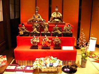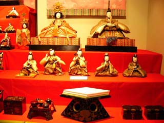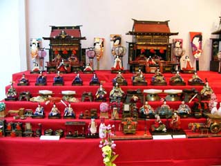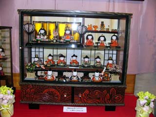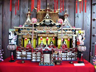 | 2010/2/22(14:38~14:42) 左の写真は、期間限定で展示されていた「おゆうさんのひな人形」。島崎藤村初恋の人「おゆうさん」のものといわれ、「五人囃子」が女性という 非常に珍しい、明治時代の「ひな人形」だそうである。 右の2枚は、いづれも昭和に入ってからの「ケース飾り」と「御殿飾り」。 |