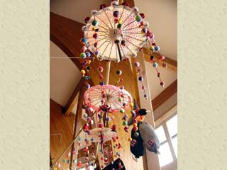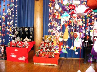 | 2010/2/22(11:21~11:24) 「森のひなまつり」に行く前に、松田町の西平畑公園で「河津桜」を見たのだが、西平畑公園の中にある「子どもの館」でも「おひなさま」が 飾られていた。 ここでは、「つるし雛」が主に飾られ、会場の1階ホールの中は、色鮮やかな「つるし雛」でいっぱい。その奥に「段飾り雛」が飾ってあった。 |