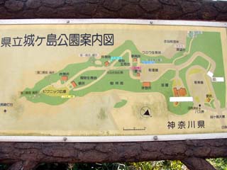 2009/9/28(13:42) 「城ヶ島公園」を入った所にある「案内図」 真中辺りが、公園入口で、左端が東側先端に ある「安房崎灯台」 |